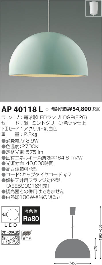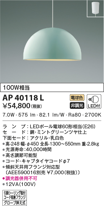 | 補足・注意事項 | ◆消費電力:7.0W ◆色温度:2700K ◆演色性:Ra80 ◆光源寿命:40,000時間 ◆高さ調節可能型 ◆コード・キャブタイヤコードφ7 ◆傾斜天井用フランジ対応型〔AEE590016 別売 \7,000(税抜)〕 ◆調光器併用不可 |