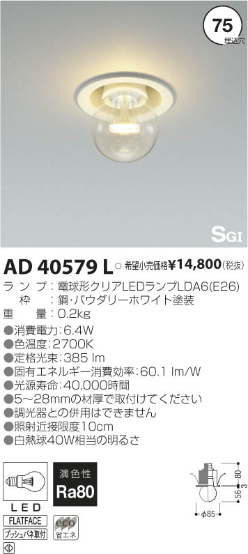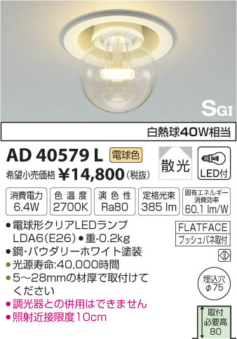 | 補足・注意事項 | ◆消費電力:6.4W ◆色温度:2700K ◆演色性:Ra80 ◆光源寿命:40,000時間 ◆5~28mmの材厚で取付けてください ◆調光器との併用はできません ◆照射近接限度10cm ◆白熱球40W相当の明るさ ※白熱球40W相当 |