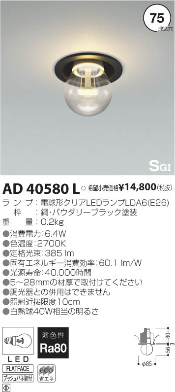 | 補足・注意事項 | ◆消費電力:6.4W ◆色温度:2700K ◆演色性:Ra80 ◆光源寿命:40,000時間 ◆5~28mmの材厚で取付けてください ◆調光器との併用はできません ◆照射近接限度10cm ◆白熱球40W相当の明るさ ※白熱球40W相当 |