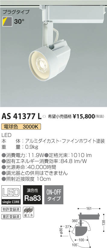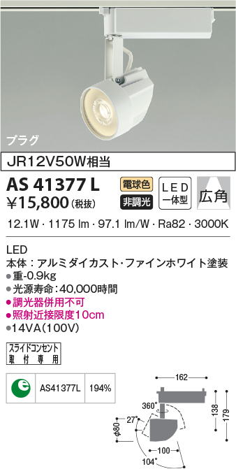 | 補足・注意事項 | ◆消費電力:12.1W ◆色温度:3000K ◆演色性:Ra82 ◆光源寿命:40,000時間 ◆調光器併用不可 ◆照射近接限度 10cm |