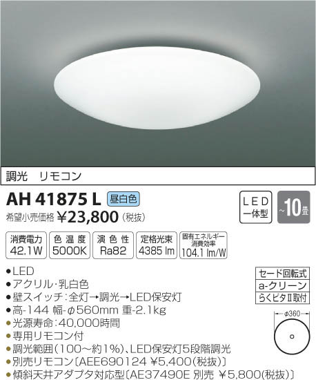 | 補足・注意事項 | ◆消費電力:42.1W ◆色温度:5000K ◆演色性:Ra82 ◆光源寿命:40,000時間 ◆専用リモコン付 ◆調光範囲(100~約1%)、LED保安灯5段階調光 ◆別売リモコン〔AEE690124 \5,400(税抜)〕 ◆傾斜天井アダプタ対応型〔AE37490E 別売 \5,800(税抜)〕 ※色温度:5000K |