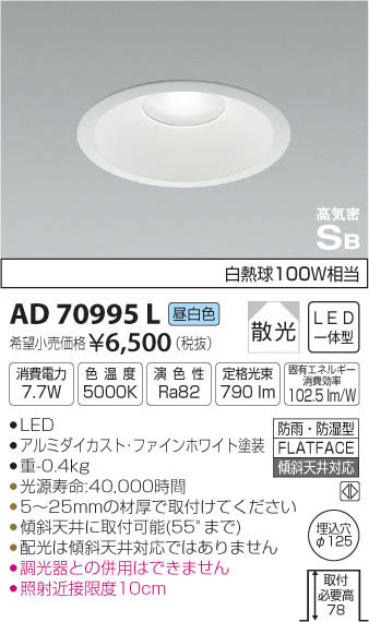 | 補足・注意事項 | ◆消費電力:7.7W ◆色温度:5000K ◆演色性:Ra82 ◆光源寿命:40,000時間 ◆5~25mmの材厚で取付けてください ◆傾斜天井に取付可能(55°まで) ◆配光は傾斜天井対応ではありません ◆調光器との併用はできません ◆照射近接限度10cm ※色温度:5000K ※白熱球100W相当  |
