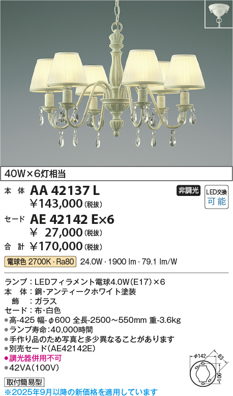 | 補足・注意事項 | ◆消費電力:24.0W ◆光束値:2400lm ◆42VA(100V) ◆色温度:2700K ◆演色性:Ra80 ◆ランプ寿命:40,000時間 ◆手作り品のため写真と多少異なることがあります ◆別売セード(AE42142E) ◆調光器併用不可 |