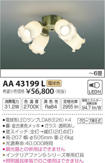 | 補足・注意事項 | ◆消費電力:31.2W ◆色温度:2700K ◆演色性:Ra84 ◆光源寿命:40,000時間 ◆インテリアファンS-シリーズ専用灯具 ◆調光器との併用はできません ※照明器具単独でのご使用はできません ※色温度:2700K |