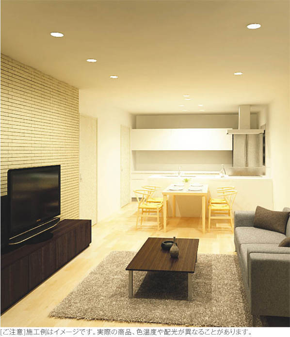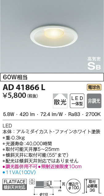 | 補足・注意事項 | ◆消費電力:5.8W ◆光束値:420lm ◆11VA(100V) ◆色温度:2700K ◆演色性:Ra83 ◆光源寿命:40,000時間 ◆取付可能天井厚5~25mm ◆傾斜天井に取付可能(55°まで) ◆配光は傾斜天井対応ではありません ◆調光器併用不可 ◆照射近接限度10cm |
