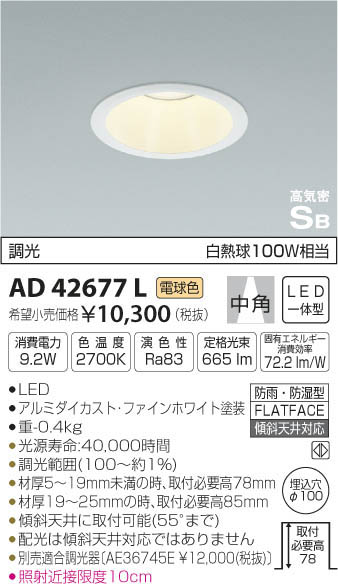| 補足・注意事項 | ◆消費電力:9.2W ◆色温度:2700K ◆演色性:Ra83 ◆光源寿命:40,000時間 ◆調光範囲(100~約1%) ◆材厚5~19mm未満の時、取付必要高78mm ◆材厚19~25mmの時、取付必要高85mm ◆傾斜天井に取付可能(55°まで) ◆配光は傾斜天井対応ではありません ◆別売適合調光器〔AE36745E \12,000(税抜)〕 ◆照射近接限度10cm ※色温度:2700K ※白熱球100W相当 |