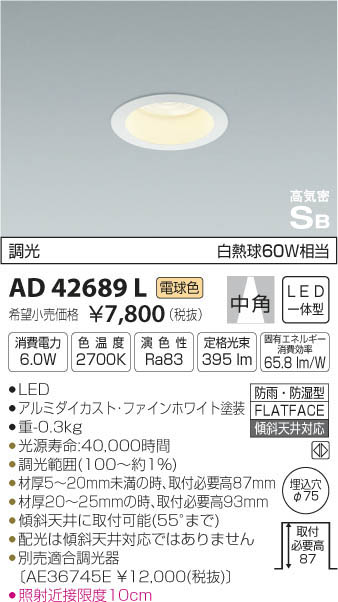 | 補足・注意事項 | ◆消費電力:6W ◆色温度:2700K ◆演色性:Ra83 ◆光源寿命:40,000時間 ◆調光範囲(100~約1%) ◆材厚5~20mm未満の時、取付必要高87mm ◆材厚20~25mmの時、取付必要高93mm ◆傾斜天井に取付可能(55°まで) ◆配光は傾斜天井対応ではありません ◆別売適合調光器〔AE36745E \12,000(税抜)〕 ◆照射近接限度10cm ※色温度:2700K ※白熱球60W相当 |