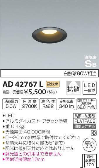 | 補足・注意事項 | ◆消費電力:5W ◆色温度:2700K ◆演色性:Ra82 ◆光源寿命:40,000時間 ◆5~20mmの材厚で取付けてください ◆傾斜天井に取付可能(55°まで) ◆配光は傾斜天井対応ではありません ◆調光器との併用はできません ◆照射近接限度10cm ※色温度:2700K ※白熱球60W相当 |