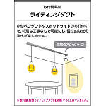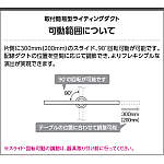 | 補足・注意事項 | ◆適合負荷100V専用600W(6A)まで ◆適合重量:5kgまで(片側のみ取付の場合2kgまで) ◆取付方向0°・90° ◆300mmスライド可能・調整角度0~90° ◆天井面に安定用部品の痕が残る場合があります ◆ライトコントローラなどの調光器と併用の場合、適合器具以外の照明器具は取付不可 |