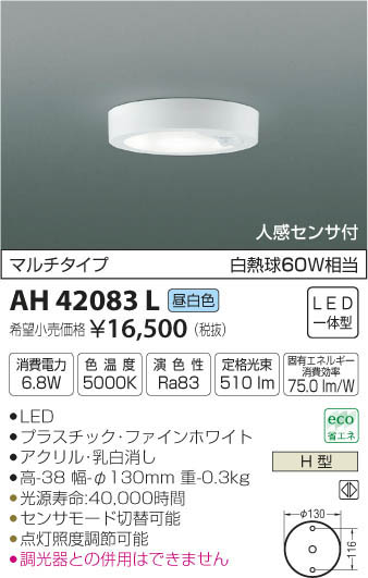 | 補足・注意事項 | ◆消費電力:6.8W ◆色温度:5000K ◆演色性:Ra83 ◆光源寿命:40,000時間 ◆センサモード切替可能 ◆点灯照度調節可能 ◆調光器との併用はできません ※色温度:5000K ※白熱球60W相当 |