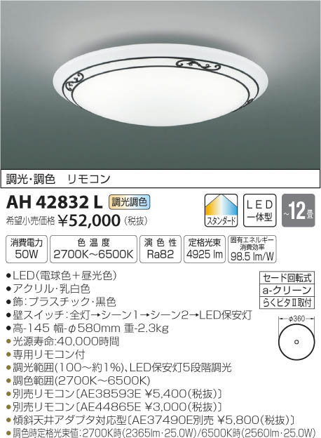 | 補足・注意事項 | ◆消費電力:50W ◆色温度:2700K ◆演色性:Ra82 ◆光源寿命:40,000時間 ◆専用リモコン付 ◆調光範囲(100~約1%)、LED保安灯5段階調光 ◆調色範囲(2700K~6500K) ◆別売リモコン〔AE38593E \5,400(税抜)〕 ◆別売リモコン〔AE44865E \3,000(税抜)〕 ◆傾斜天井アダプタ対応型〔AE37490E別売 \5,800(税抜)〕 ◆調色時定格光束値:2700K時(2365lm・25.0W)/6500K時(2560lm・25.0W) ※色温度:2700K~6500K |