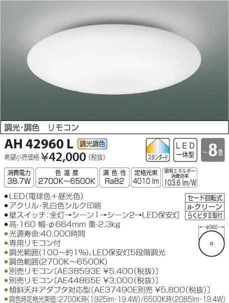 | 補足・注意事項 | ◆消費電力:38.7W ◆色温度:2700K ◆演色性:Ra82 ◆光源寿命:40,000時間 ◆専用リモコン付 ◆調光範囲(100~約1%)、LED保安灯5段階調光 ◆調色範囲(2700K~6500K) ◆別売リモコン〔AE38593E \5,400(税抜)〕 ◆別売リモコン〔AE44865E \3,000(税抜)〕 ◆竿縁天井取付アダプタ対応型〔AE44068E別売 \2,400(税抜)〕 ◆傾斜天井アダプタ対応型〔AE37490E別売 \5,800(税抜)〕 ◆調色時定格光束値:2700K時(1925lm・19.4W)/6500K時(2085lm・19.4W) ※色温度:2700K~6500K |