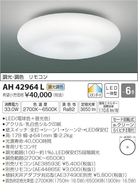 | 補足・注意事項 | ◆消費電力:33W ◆色温度:2700K ◆演色性:Ra82 ◆光源寿命:40,000時間 ◆専用リモコン付 ◆調光範囲(100~約1%)、LED保安灯5段階調光 ◆調色範囲(2700K~6500K) ◆別売リモコン〔AE38593E \5,400(税抜)〕 ◆別売リモコン〔AE44865E \3,000(税抜)〕 ◆傾斜天井アダプタ対応型〔AE37490E別売 \5,800(税抜)〕 ◆調色時定格光束値:2700K時(1750lm・16.5W)/6500K時(1900lm・16.5W) ※色温度:2700K~6500K |