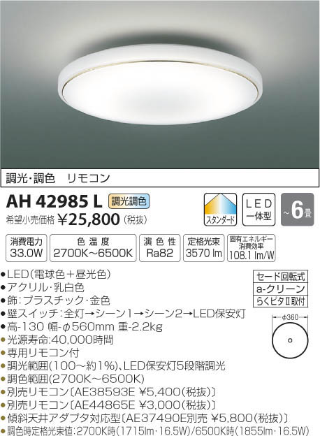 | 補足・注意事項 | ◆消費電力:33W ◆色温度:2700K ◆演色性:Ra82 ◆光源寿命:40,000時間 ◆専用リモコン付 ◆調光範囲(100~約1%)、LED保安灯5段階調光 ◆調色範囲(2700K~6500K) ◆別売リモコン〔AE38593E \5,400(税抜)〕 ◆別売リモコン〔AE44865E \3,000(税抜)〕 ◆傾斜天井アダプタ対応型〔AE37490E別売 \5,800(税抜)〕 ◆調色時定格光束値:2700K時(1715lm・16.5W)/6500K時(1855lm・16.5W) ※色温度:2700K~6500K |