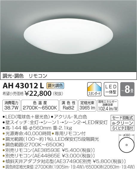 | 補足・注意事項 | ◆消費電力:38.7W ◆色温度:2700K ◆演色性:Ra82 ◆光源寿命:40,000時間 ◆専用リモコン付 ◆調光範囲(100~約1%)、LED保安灯5段階調光 ◆調色範囲(2700K~6500K) ◆別売リモコン〔AE38593E \5,400(税抜)〕 ◆別売リモコン〔AE44865E \3,000(税抜)〕 ◆傾斜天井アダプタ対応型〔AE37490E別売 \5,800(税抜)〕 ◆調色時定格光束値:2700K時(1905lm・19.4W)/6500K時(2060lm・19.4W) ※色温度:2700K~6500K |