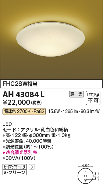 | 補足・注意事項 | ◆消費電力:15.8W ◆色温度:2700K ◆演色性:Ra82 ◆光源寿命:40,000時間 ◆調光範囲約1~100% ◆適合調光器別売 |