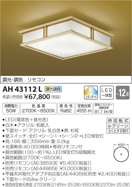 | 補足・注意事項 | ◆消費電力:50W ◆色温度:2700K ◆演色性:Ra82 ◆光源寿命:40,000時間 ◆専用リモコン付 ◆調光範囲(100~約1%)、LED保安灯5段階調光 ◆調色範囲(2700K~6500K) ◆別売リモコン〔AE38593E \5,400(税抜)〕 ◆別売リモコン〔AE44865E \3,000(税抜)〕 ◆竿縁天井取付アダプタ対応型〔AE44068E別売 \2,400(税抜)〕 ◆下面セードのみa-クリーン ◆調色時定格光束値:2700K時(2185lm・25.0W)/6500K時(2370lm・25.0W) ※色温度:2700K~6500K |