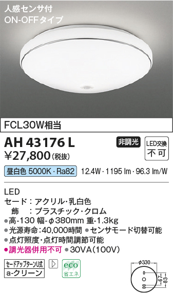 | 補足・注意事項 | ◆消費電力:12.4W ◆光束値:1195lm ◆30VA(100V) ◆色温度:5000K ◆演色性:Ra82 ◆光源寿命:40,000時間 ◆センサモード切替可能 ◆点灯照度・点灯時間調節可能 ◆調光器併用不可 |