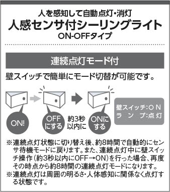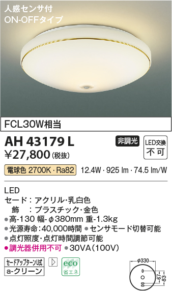 | 補足・注意事項 | ◆消費電力:12.4W ◆光束値:925lm ◆30VA(100V) ◆色温度:2700K ◆演色性:Ra82 ◆光源寿命:40,000時間 ◆センサモード切替可能 ◆点灯照度・点灯時間調節可能 ◆調光器併用不可 |