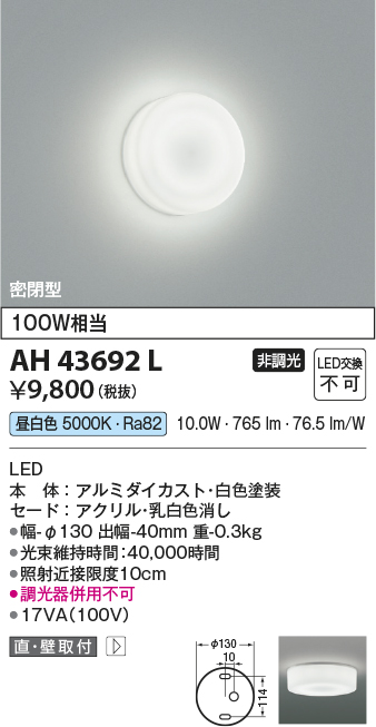 | 補足・注意事項 | ◆消費電力:10.0W ◆光束値:765lm ◆17VA(100V) ◆色温度:5000K ◆演色性:Ra82 ◆光束維持時間:40,000時間 ◆照射近接限度10cm ◆調光器併用不可 |