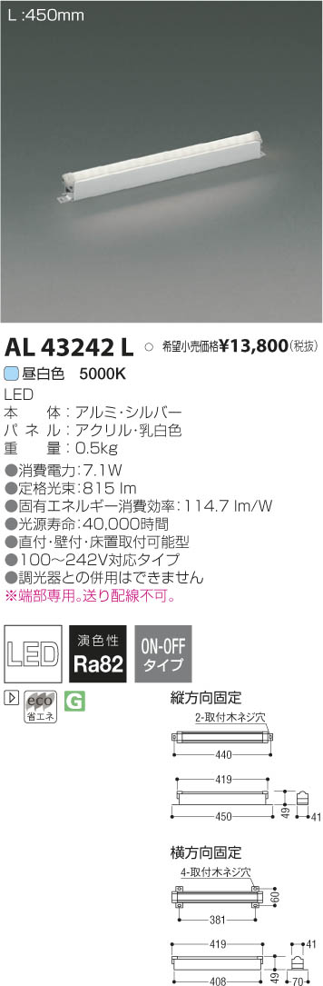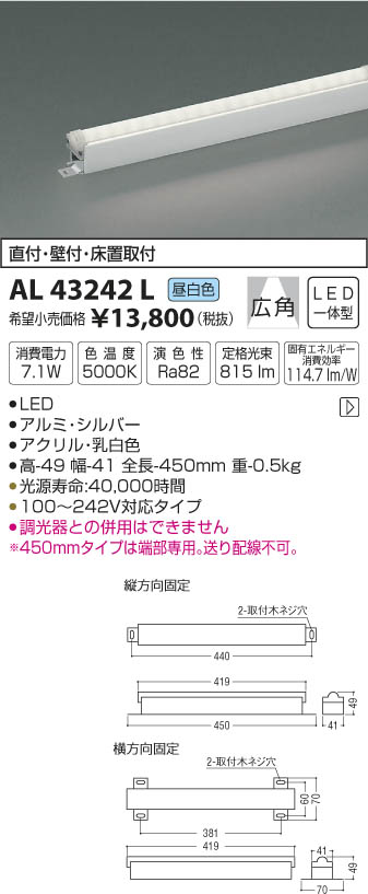 | 補足・注意事項 | ◆消費電力:7.1W ◆色温度:5000K ◆演色性:Ra82 ◆光源寿命:40,000時間 ◆直付・壁付・床置取付可能型 ◆100~242V対応タイプ ◆調光器との併用はできません ※端部専用。送り配線不可。 |