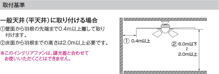 | 補足・注意事項 | ◆消費電力:35.0W ◆光束値:3695lm ◆59VA(100V) ◆色温度:2700K ◆演色性:Ra80 ◆ランプ寿命:40,000時間 ◆回転切替ボタン付(リモコン) ◆4段スピード切替ボタン付(リモコン) ◆30分/60分タイマー付(リモコン) ◆調光器併用不可 ◆延長パイプ取付不可 |