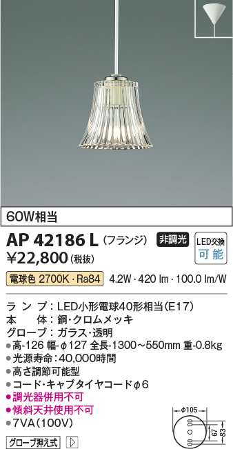 | 補足・注意事項 | ◆消費電力:4.2W ◆光束値:420lm ◆7VA(100V) ◆色温度:2700K ◆演色性:Ra84 ◆光源寿命:40,000時間 ◆高さ調節可能型 ◆コード・キャブタイヤコードφ6 ◆調光器併用不可 ◆傾斜天井使用不可 |