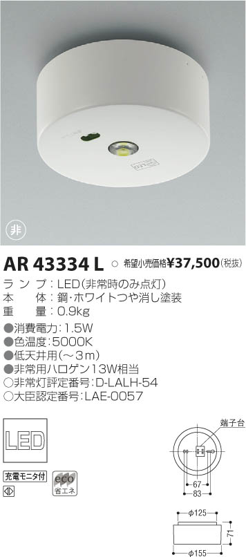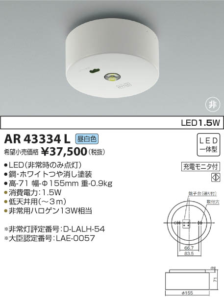 | 補足・注意事項 | ◆消費電力:1.5W ◆色温度:5000K ◆低天井用(~3m) ◆非常用ハロゲン13W相当 ◆非常灯評定番号:D-LALH-54 ◆大臣認定番号:LAE-0057 |