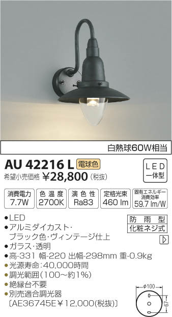 補足・注意事項 | ◆消費電力:7.7W ◆色温度:2700K ◆演色性:Ra83 ◆光源寿命:40,000時間 ◆調光範囲(100~約1%) ◆絶縁台不要 ◆別売適合調光器〔AE36745E \12,000(税抜)〕 ※色温度:2700K ※白熱球60W相当 |