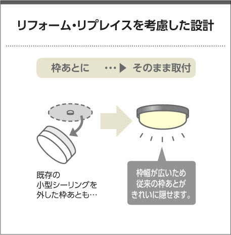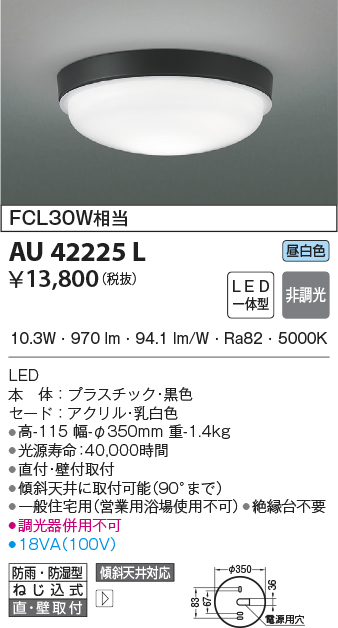 | 補足・注意事項 | ◆消費電力:10.3W ◆光束値:970lm ◆18VA(100V) ◆色温度:5000K ◆演色性:Ra82 ◆光源寿命:40,000時間 ◆直付・壁付取付 ◆傾斜天井に取付可能(90°まで) ◆一般住宅用(営業用浴場使用不可) ◆絶縁台不要 ◆調光器併用不可 |