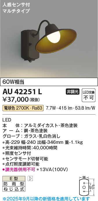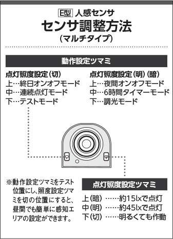 | 補足・注意事項 | ◆消費電力:7.7W ◆光束値:415lm ◆13VA(100V) ◆色温度:2700K ◆演色性:Ra83 ◆光束維持時間:40,000時間 ◆照度センサ付 ◆センサモード切替可能 ◆点灯照度調節可能 ◆調光器併用不可 |