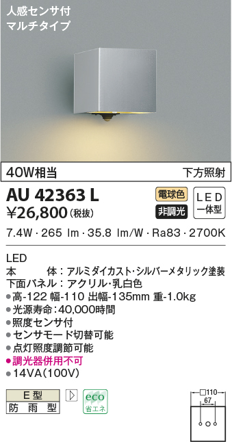| 補足・注意事項 | ◆消費電力:7.4W ◆光束値:265lm ◆14VA(100V) ◆色温度:2700K ◆演色性:Ra83 ◆光源寿命:40,000時間 ◆照度センサ付 ◆センサモード切替可能 ◆点灯照度調節可能 ◆調光器併用不可 |