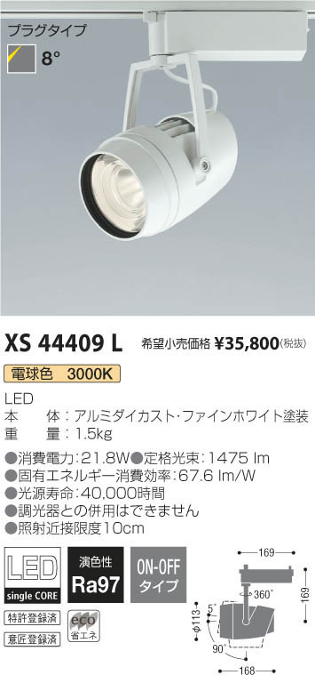 | 補足・注意事項 | ◆消費電力:21.8W ◆色温度:3000K ◆演色性:Ra97 ◆光源寿命:40,000時間 ◆調光器との併用はできません ◆照射近接限度10cm ※色温度:3000K ※HID35~50W相当 |
