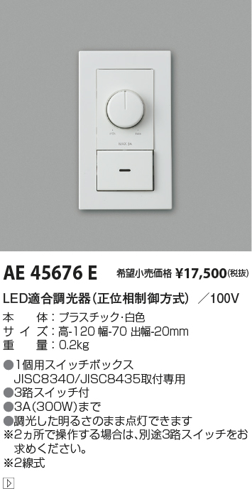 | 補足・注意事項 | ◆1個用スイッチボックスJISC8340/JISC8435取付専用 ◆3路スイッチ付 ◆調光した明るさのまま点灯できます ◆3A(300VA)まで ※2ヵ所で操作する場合は、別途3路スイッチをお求めください ※2線式 |