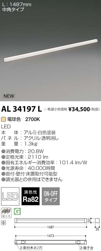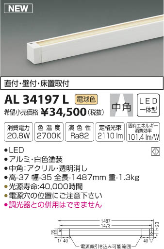 | 補足・注意事項 | ◆消費電力:20.8W ◆色温度:2700K ◆演色性:Ra82 ◆光源寿命:40,000時間 ◆直付・壁付・床置取付可能型 ◆調光器との併用はできません |