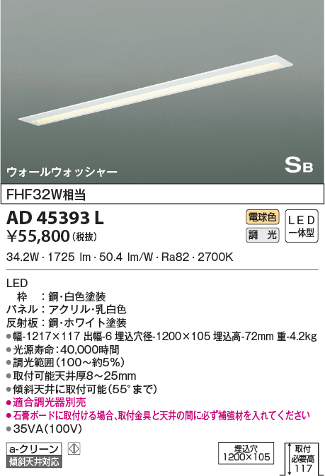 | サイズ | 幅-1217×117 出幅-6 埋込穴径-1200×105 埋込高-72 取付必要高-117mm 重-4.2kg |