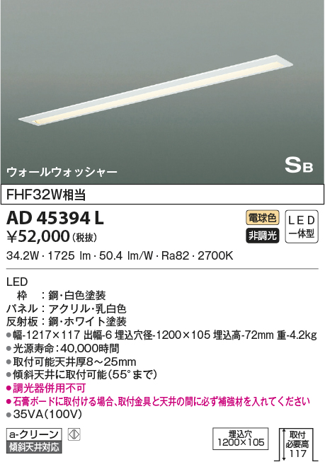| サイズ | 幅-1217×117 出幅-6 埋込穴径-1200×105 埋込高-72 取付必要高-117mm 重-4.2kg |