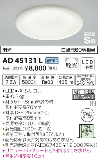 | 補足・注意事項 | ◆消費電力:7.5W ◆色温度:5000K ◆演色性:Ra83 ◆光源寿命:40,000時間 ◆調光範囲(100~約1%) ◆材厚5~18mm未満の時、取付必要高78mm ◆材厚18~25mmの時、取付必要高85mm ◆傾斜天井に取付可能(55°まで) ◆配光は傾斜天井対応ではありません ◆別売適合調光器〔AE36745E \12,000(税抜)〕 ◆リニューアルプレートとの併用はできません ◆照射近接限度10cm ※色温度:5000K ※白熱球60W相当 |