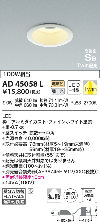 | 補足・注意事項 | ◆消費電力:9.0W ◆色温度:2700K ◆演色性:Ra83 ◆光源寿命:40,000時間 ◆取付必要高:78mm(材厚5~19mm未満時)89mm(材厚19~25mm時) ◆傾斜天井に取付可能(55°まで) ◆配光は傾斜天井対応ではありません ◆調光範囲(100~約1%) ◆別売適合調光器〔AE36745E \12,000(税抜)〕 ◆照射近接限度10cm |