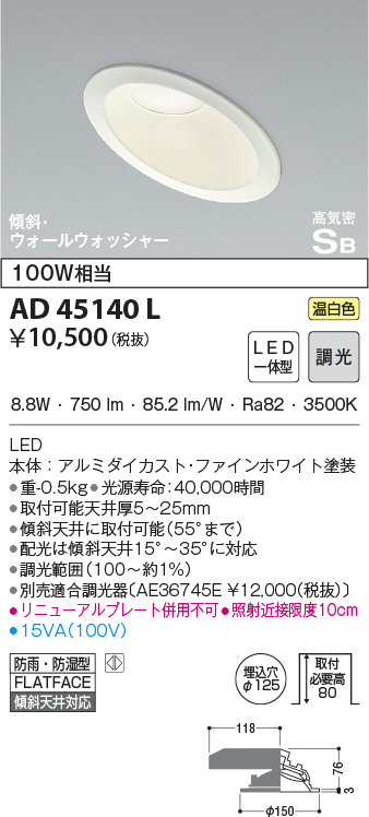 | 補足・注意事項 | ◆消費電力:8.8W ◆光束値:750lm ◆15VA(100V) ◆色温度:3500K ◆演色性:Ra82 ◆光源寿命:40,000時間 ◆調光範囲(100~約1%) ◆取付可能天井厚5~25mm ◆傾斜天井に取付可能(55°まで) ◆配光は傾斜天井15°~35°に対応 ◆別売適合調光器〔AE36745E \12,000(税抜)〕 ◆リニューアルプレート併用不可 ◆照射近接限度10cm |