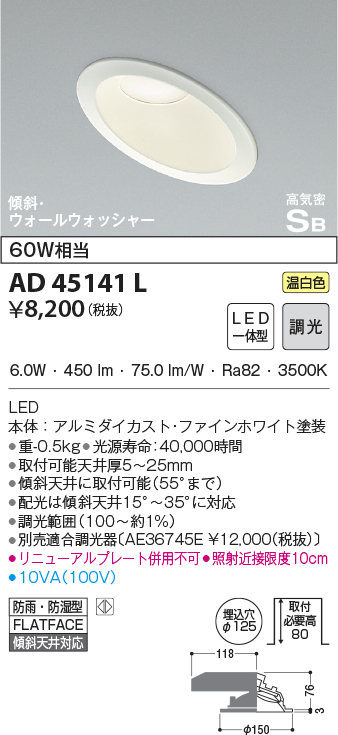 | 補足・注意事項 | ◆消費電力:6.0W ◆色温度:3500K ◆演色性:Ra82 ◆光源寿命:40,000時間 ◆調光範囲(100~約1%) ◆取付可能天井厚5~25mm ◆傾斜天井に取付可能(55°まで) ◆配光は傾斜天井15°~35°に対応 ◆別売適合調光器〔AE36745E \12,000(税抜)〕 ◆リニューアルプレート併用不可 ◆照射近接限度10cm |
