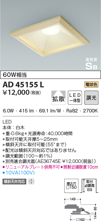 | 補足・注意事項 | ◆消費電力:6.0W ◆光束値:415lm ◆10VA(100V) ◆色温度:2700K ◆演色性:Ra82 ◆光源寿命:40,000時間 ◆調光範囲(100~約1%) ◆取付可能天井厚5~25mm ◆傾斜天井に取付可能(55°まで) ◆配光は傾斜天井対応ではありません ◆別売適合調光器〔AE36745E \12,000(税抜)〕 ◆リニューアルプレート併用不可 ◆照射近接限度10cm |
