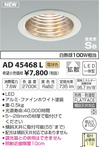 | 補足・注意事項 | ◆消費電力:7.6W ◆色温度:2700K ◆演色性:Ra82 ◆光源寿命:40,000時間 ◆5~28mmの材厚で取付けてください ◆傾斜天井に取付可能(55°まで) ◆配光は傾斜天井対応ではありません ◆調光器との併用はできません ◆照射近接限度10cm ※色温度:2700K ※白熱球100W相当 |