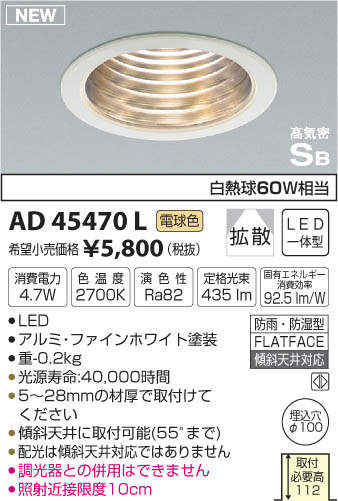 | 補足・注意事項 | ◆消費電力:4.7W ◆色温度:2700K ◆演色性:Ra82 ◆光源寿命:40,000時間 ◆5~28mmの材厚で取付けてください ◆傾斜天井に取付可能(55°まで) ◆配光は傾斜天井対応ではありません ◆調光器との併用はできません ◆照射近接限度10cm ※色温度:2700K ※FHT42W相当 |