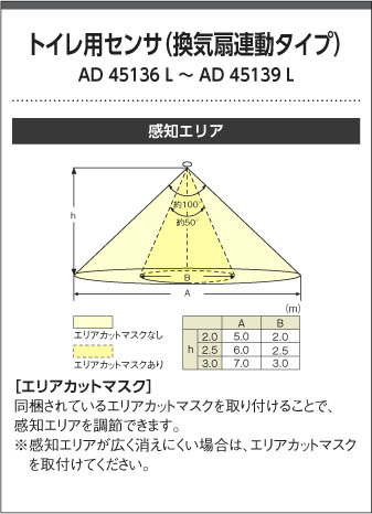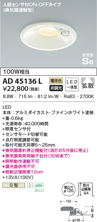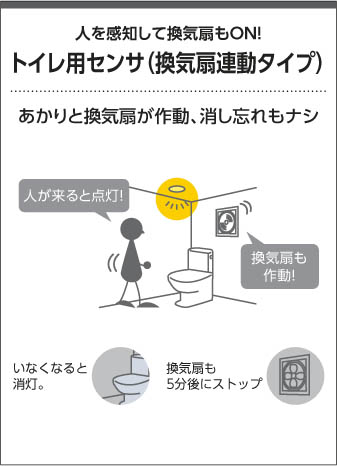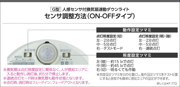 | 補足・注意事項 | ◆消費電力:8.8W ◆色温度:2700K ◆演色性:Ra83 ◆光源寿命:40,000時間 ◆照度センサ付 ◆センサーモード切替可能 ◆点灯照度調節可能 ◆取付可能天井厚5~25mm ◆換気扇遅れ停止機能付(消灯の5分後に停止) ◆換気扇負荷用端子台付(30Wまで) ◆照明動作連動不可 ◆調光器併用不可 ◆照射近接限度10cm |