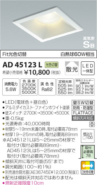| 補足・注意事項 | ◆消費電力:5.6W ◆色温度:2700K ◆演色性:Ra82 ◆光源寿命:40,000時間 ◆5~25mmの材厚で取付け(取付必要高78mm) ◆傾斜天井に取付可能(55°まで) ◆配光は傾斜天井対応ではありません ◆調光範囲(100~約1%) ◆別売適合調光器〔AE36745E \12,000(税抜)〕 ◆照射近接限度10cm ※色温度:2700K|3500K|5000K ※白熱球60W相当 |