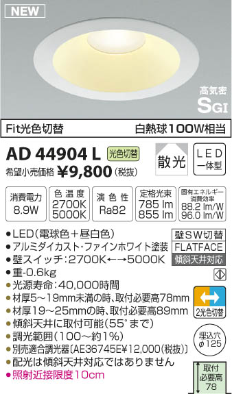 | 補足・注意事項 | ◆消費電力:8.9W ◆色温度:2700K ◆演色性:Ra82 ◆光源寿命:40,000時間 ◆材厚5~19mm未満の時、取付必要高78mm ◆材厚19~25mmの時、取付必要高89mm ◆傾斜天井に取付可能(55°まで) ◆配光は傾斜天井対応ではありません ◆調光範囲(100~約1%) ◆別売適合調光器〔AE36745E \12,000(税抜)〕 ◆別売適合調光器〔AE36745E \12,000(税抜)〕 ◆照射近接限度10cm ※色温度:2700|5000K ※白熱球100W相当 |