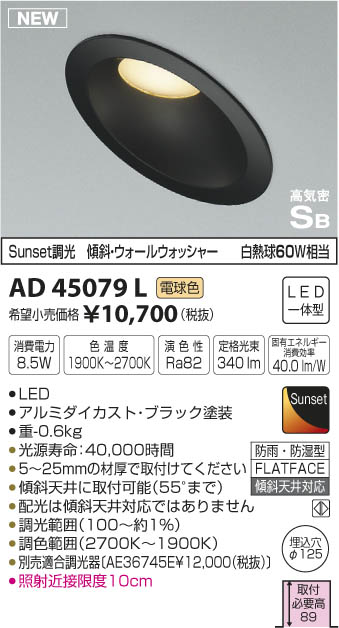 | 補足・注意事項 | ◆消費電力:8.5W ◆色温度:2700K ◆演色性:Ra82 ◆光源寿命:40,000時間 ◆5~25mmの材厚で取付けてください ◆傾斜天井に取付可能(55°まで) ◆配光は傾斜天井対応ではありません ◆調光範囲(100~約1%) ◆調色範囲(2700K~1900K) ◆別売適合調光器〔AE36745E \12,000(税抜)〕 ◆別売適合調光器〔AE36745E \12,000(税抜)〕 ◆照射近接限度10cm ※色温度:1900~2700K ※白熱球60W相当 |