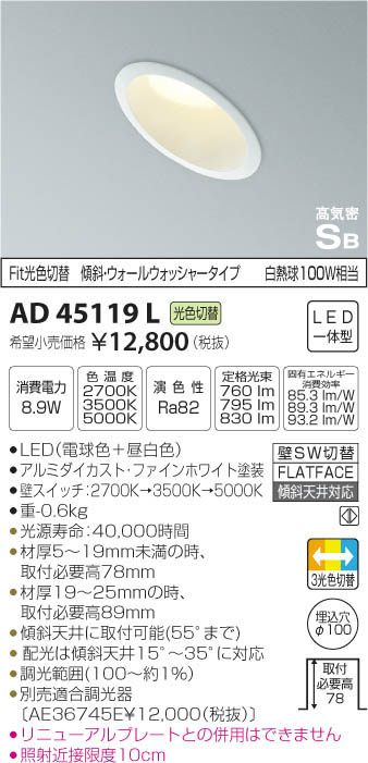 | 補足・注意事項 | ◆消費電力:8.9W ◆色温度:2700K ◆演色性:Ra82 ◆光源寿命:40,000時間 ◆材厚5~19mm未満の時、取付必要高78mm ◆材厚19~25mmの時、取付必要高89mm ◆傾斜天井に取付可能(55°まで) ◆配光は傾斜天井15°~35°に対応 ◆調光範囲(100~約1%) ◆別売適合調光器〔AE36745E \12,000(税抜)〕 ◆リニューアルプレートとの併用はできません ◆照射近接限度10cm ※色温度:2700K|3500K|5000K ※白熱球100W相当 |