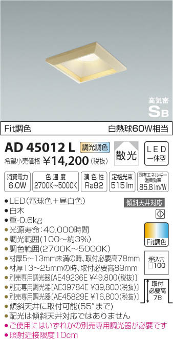 | 補足・注意事項 | ◆消費電力:6W ◆色温度:2700K ◆演色性:Ra82 ◆光源寿命:40,000時間 ◆材厚5~13mm未満の時、取付必要高78mm ◆材厚13~25mmの時、取付必要高89mm ◆傾斜天井に取付可能(55°まで) ◆配光は傾斜天井対応ではありません ◆調光範囲(100~約3%) ◆調色範囲(2700K~5000K) ◆別売専用調光器〔AE49236E \49,800(税抜)〕 ◆別売専用調光器〔AE39784E \39,800(税抜)〕 ◆別売専用調光器〔AE45829E \16,800(税抜)〕 ◆ご使用にはいずれかの別売専用調光器が必要です ◆照射近接限度10cm ※色温度:2700K~5000K ※白熱球60W相当 |